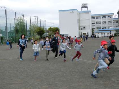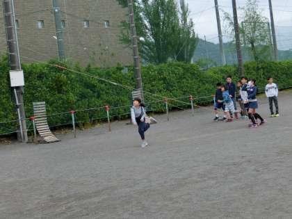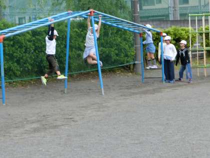 先生方も一緒に走っていました。走り終えた人は、バトンスローや雲梯にチャレンジしていました。多くの人が朝から体を動かしています。