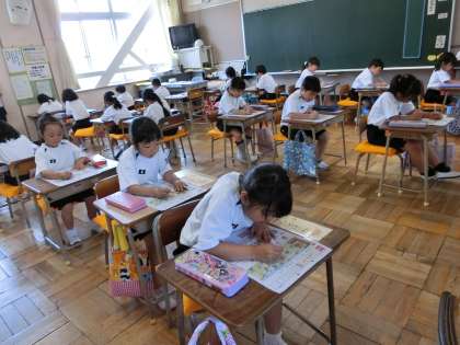1年生が算数のテストをやっていました。みんな真剣に取り組んでいました。