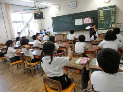 2年生が算数の時間に「1000までの数」の確かめ問題に挑戦していました。運動会の得点板を使って、位の数字の意味を考えていました。
