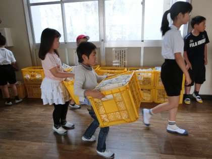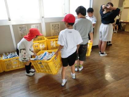 今日は月に1度の牛乳パック回収日です。朝早くから給食委員さんや当番さんが、黄色いコンテナを職員玄関前に運んでいました。集まった牛乳パックはトイレットペーパーにリサイクルされます。