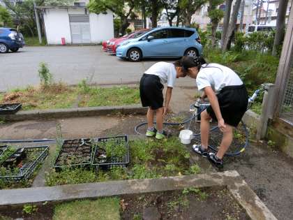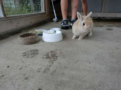 4年生がうさぎの世話をしていました。床をブラシでごしごしとていねいに掃除をして、とてもきれいにしてくれました。チョコもうれしそうにしていました。
