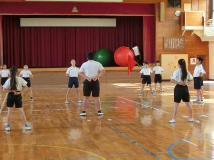 朝です。体育館で応援団が練習していました。運動会目指してがんばっています。