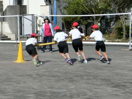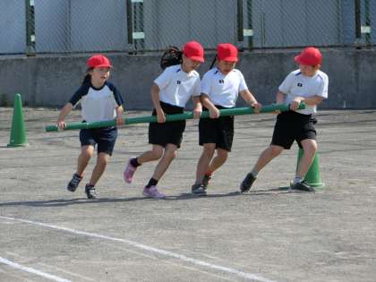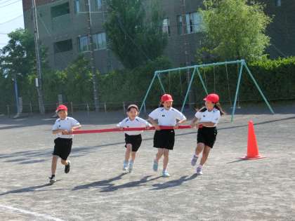 コーンの回り方が上手になっています。回る時には中央の人が力を入れてずれないように、直線コースは気持ちと足並みをそろえて走っていました。
