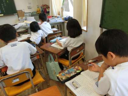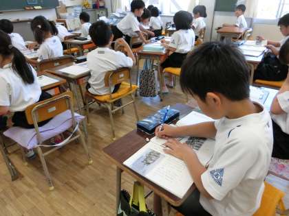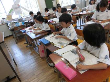 2年生が国語の時間に説明文を読んでいました。いくつの形式段落で作られているのか、本文を読んでまとまりを探していました。手掛かりは、一文字下がりを見つけることだそうです。友達と確かめながら数えていました。