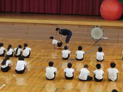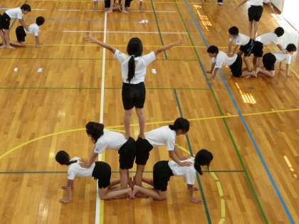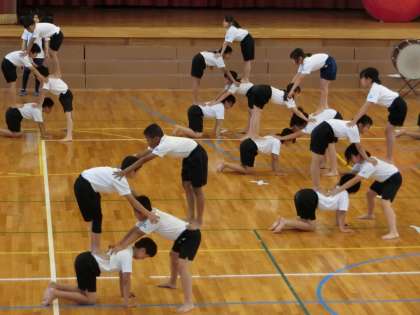 5年生が体育館で組体操の技を、一つ一つ確認していました。安全に組むための確認、美しく見えるための確認、真剣に取り組んでいました。