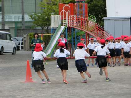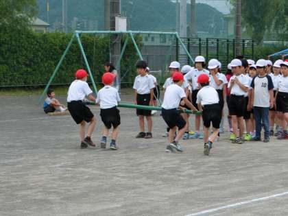 竹の棒を受け渡すところも作戦があるようです。朝・緑・黄色、それぞれ3年生と4年生が力を合わせて練習していました。