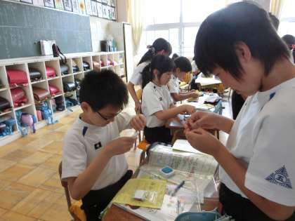 5年生が裁縫をしていました。今日は、基本の基本。玉結びと玉留めの練習をしていました。だんだん上手になってきました。