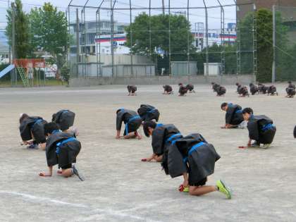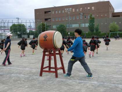 3・4年生が「よっちょれ」の通し練習をしていました。太鼓の合図で入場し、音楽に合わせて元気に踊っていました。