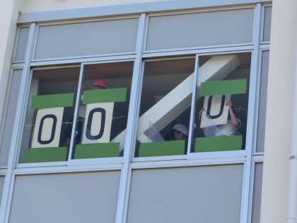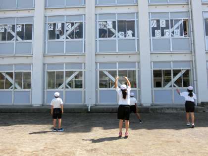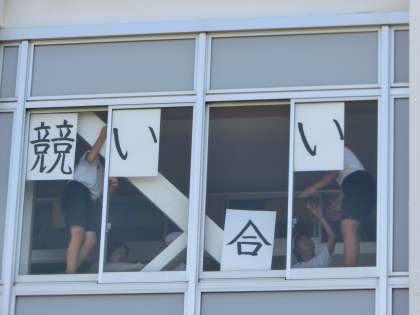 スローガンも得点板もバランスよく貼れるように、外から合図を送りながら作業をしていました。