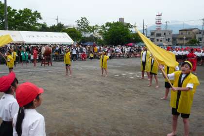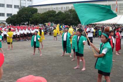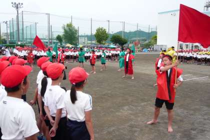 プログラム2番は、全校児童による「天下分け目の応援合戦」です。赤組、緑組、黄組、応援団の掛け声のもと、気持ちを1つに優勝を目指します。どの組もとびきり大きな声が出ています。