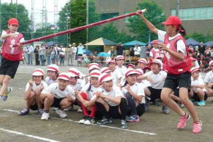 大きな声を掛け合って気持ちをそろえてジャンプしたりしゃがんだり。見守る先生たちも叫んでいます。