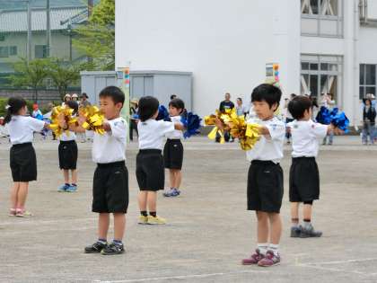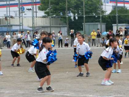 青いキラキラが1年生。金色のキラキラが2年生です。ドラえもんの音楽に合わせて、体じゅうを使って表現していました。にこにこ顔の1・2年生のダンスに、見ているこちらも笑顔になってしまいました。