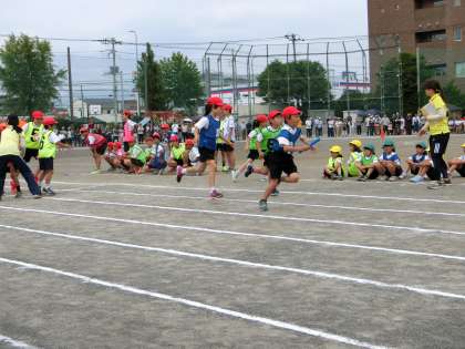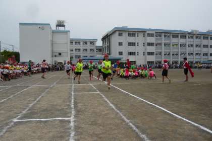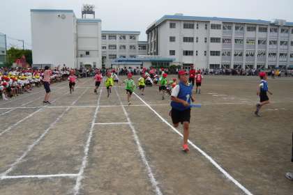 声援を受けて、選手が力いっぱい走っています。応援席からの「がんばれー」の声がやみません。