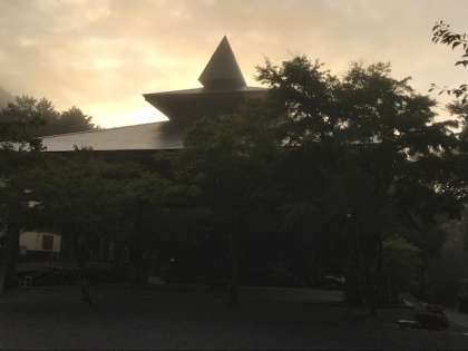 6時です。全員起床しました。朝の身支度や布団の片付けをしています。昨晩の雨は上がっています。