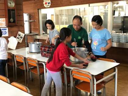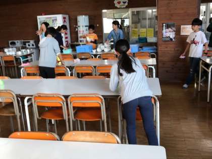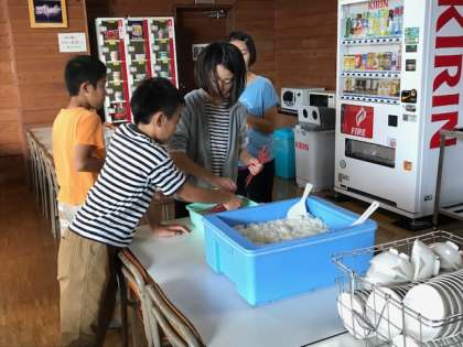 食事係さんが食堂に集まりました。朝食の準備が始まりました。
