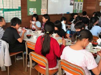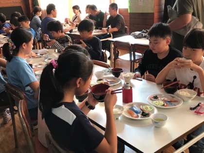 シャケ、ふりかけ、ウインナー、おひたし、ポテトサラダ、ご飯、お麩の味噌汁です。