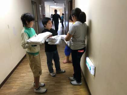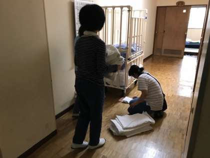 生活係さんがシーツを集めています。枚数を確認して返却していました。