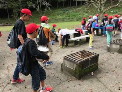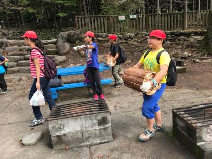 薪、お鍋、材料を運んでいます。