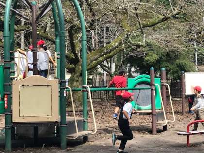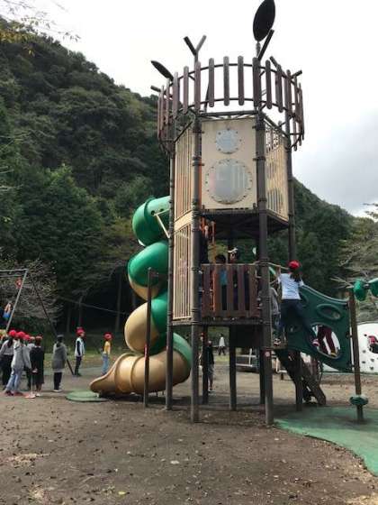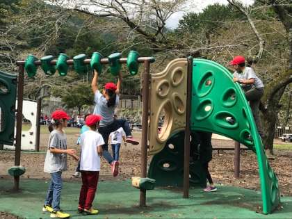 おもしろい遊具があります。仲よく遊んでいます。