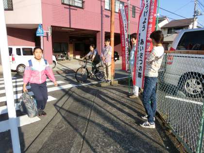 10月10日は「あいさつの輪の日」でした。地域の皆さんが校区のいろいろなところに出て、子どもたちに声掛けをしてくださいました。自ら地域の方にあいさつをする小学生や中学生が増えています。