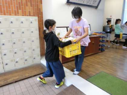 今日は牛乳パックの回収日です。「牛乳パックを持って来てください。」という給食委員さんの放送が流れると、次々に黄色いコンテナが運ばれてきました。職員玄関前に集まったコンテナを、給食委員の皆さんが回収場所に積み上げていました。皆さん、朝からご苦労様です。牛乳パックはトイレットペーパーにリサイクルされます。