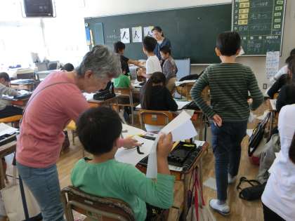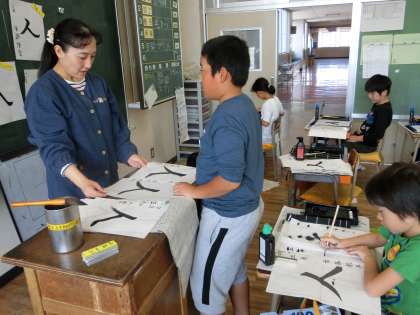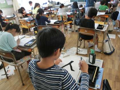 3年生が佐藤先生の毛筆の授業を受けていました。今日の課題文字は「人」です。半紙いっぱいに大きく書いていました。