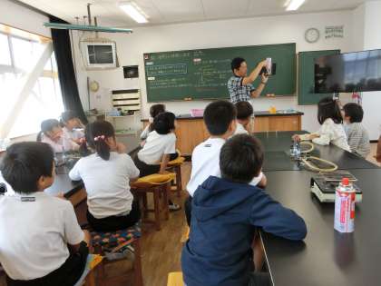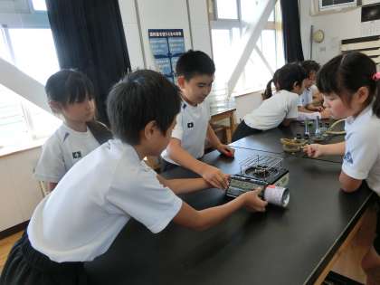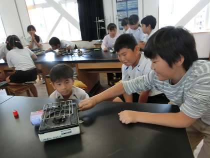 4年生が理科の時間にガスコンロの使い方を練習していました。この次の時間に、金属の体積と温度の関係を調べる実験をするそうです。ガスボンベをはめたり、調節つまみを回して火を付けたり、正しく使う練習をしていました。