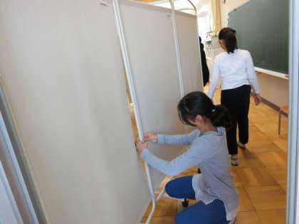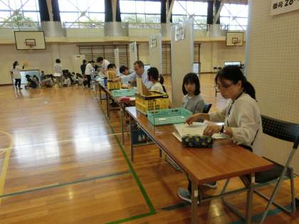 お弁当を食べたあと、用具を運んだりスクリーンを並べたりと、各教室を整えました。受付も準備万端です。5年生が一生懸命働いています。