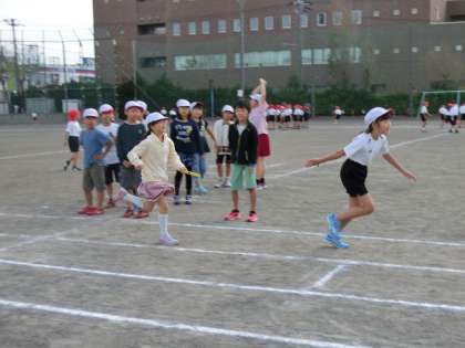 バトンが上手にパスされるように、リードのタイミングを考えながら練習していました。