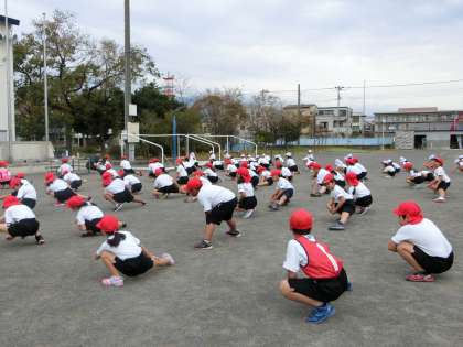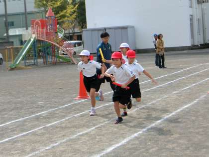 3年生が体育の時間に、学年合同リレーを行いました。各クラス2チームに分かれて競い合いました。