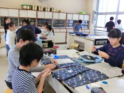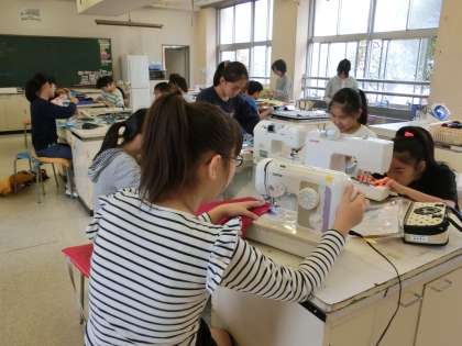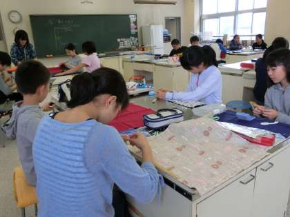6年生が家庭科室でランチョンマット型のお弁当包みを縫っていました。家庭科の授業も2年目となり、針を動かす手つきも慣れてきました。みんな上手に縫っていました。