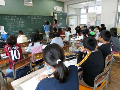 4年生が「がい数」の練習問題に取り組んでいました。文章題を読んで、式を立て、計算していました。四捨五入の意味もやり方もよく身についたようです。前に出て発表する友だちをしっかりと見ていました。