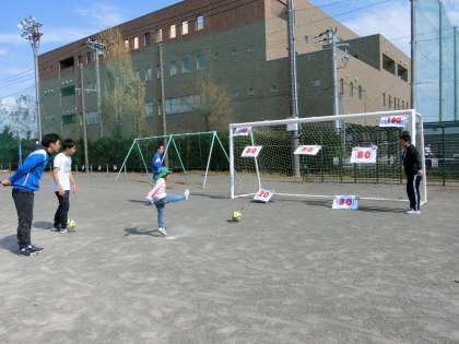 運動場東側では、ストラックアウトが行われていました。100点目指して、思い切りキックしていました。的に当たると見ている人たちから拍手が起こっていました。