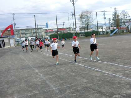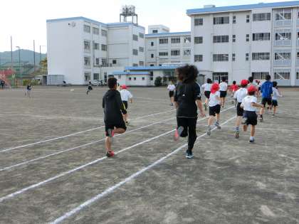 体育委員さんの合図で1周走がスタートしました。いろいろな学年が混じって走っていました。