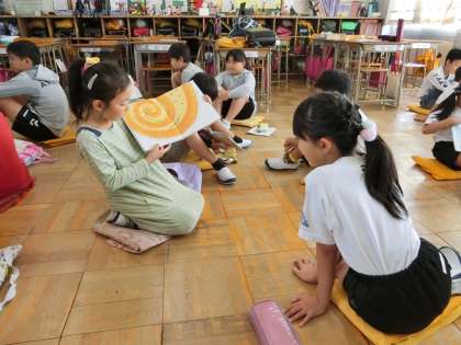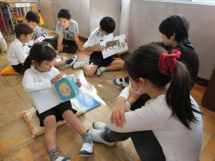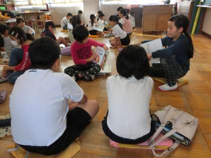 今日はペア読書の日。低学年の人が高学年の人に読み聞かせをしました。上手に読めるようにと、練習をしてきた人もいるそうです。