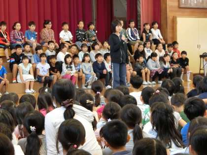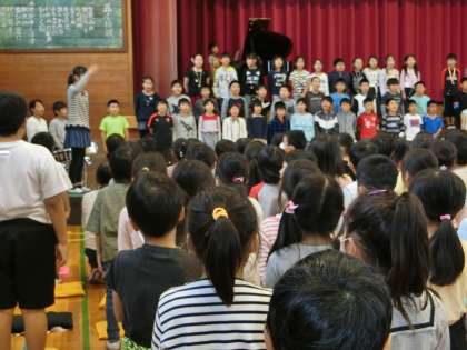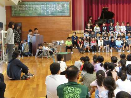 3時間目に音楽会を行いました。今回は4年生と6年生の発表でした。6年生の司会、始めの言葉で会が始まりました。始めに、全校で「勇気100%」を歌いました。