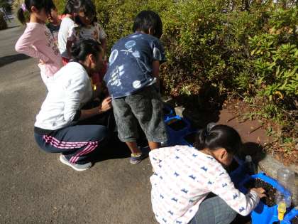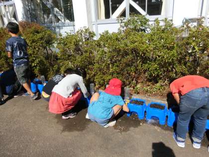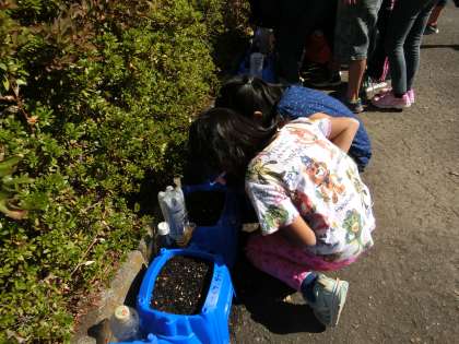 2年生が先日種蒔きをした野菜を観察していました。よーく見ると、小さい小さい芽が出ていました。「アサガオの芽とは違う形だよ。」と教えてくれました。