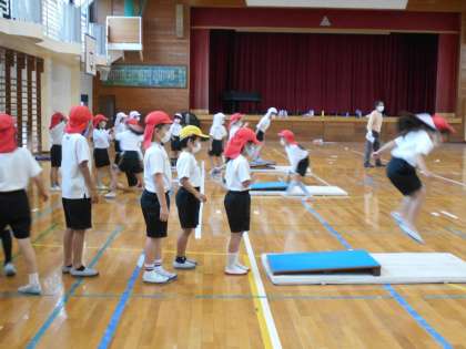 1学期にもお世話になった、マット・跳び箱指導のプロ、岩崎 博先生に、2年生が跳び箱を教えていただくことになりました。「パプリカ」の曲にのって、念入りに準備運動をします。今日は、跳び箱につながる動きを行いました。