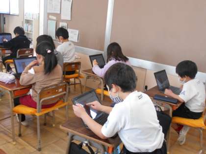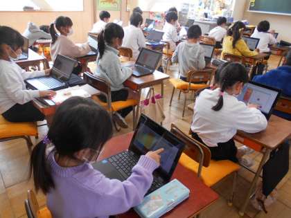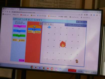 1年2組では、クロームブックを使って、算数のプログラミングの学習をしていました。火事から犬を助けるために、ロボくんに指示を出して動かし方を考えます。