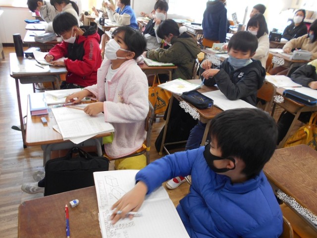 2月8日(木) 4年生 授業の様子 公開日 2024/02/08 更新日 2024/02/08 4年生 4年生は、1組も2組も算数の授業でした。直方体の見取り図を描く学習をしていました。見えないところは、点線で描くことを確認して、ていねいに描いていました。 いいね(0) 4年生