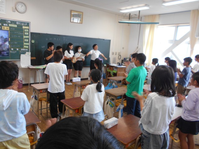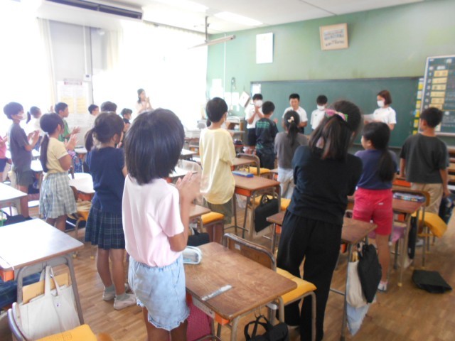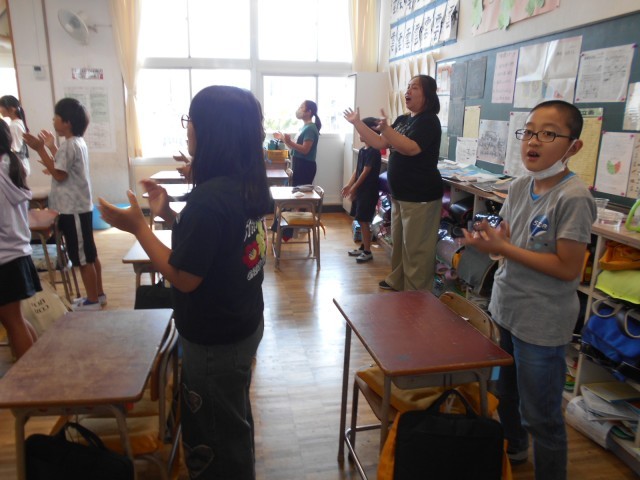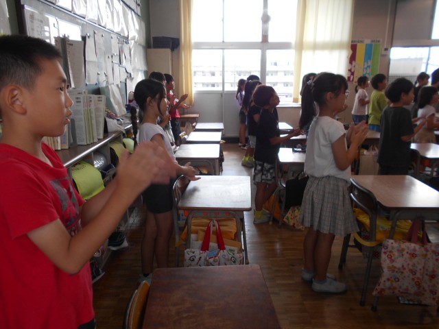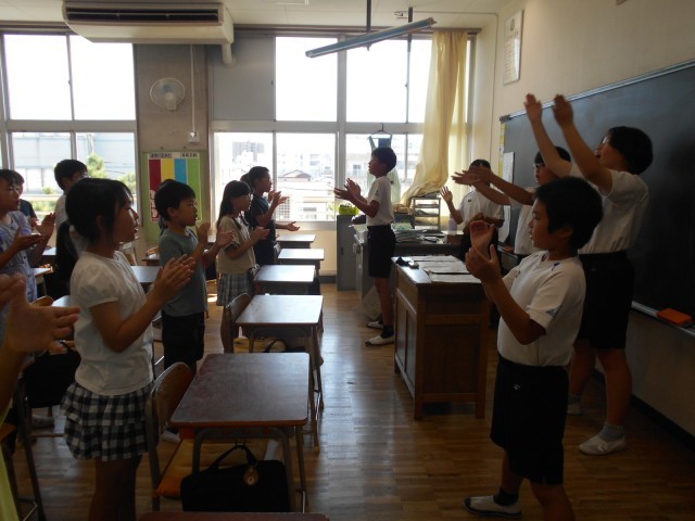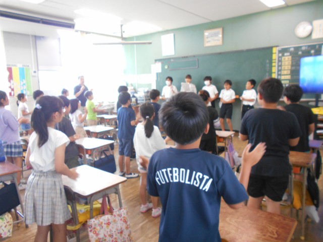 昼休みに応援練習を行いました。今日は、3・4年生に応援団が教えに行きました。初回でしたが、赤組も白組もよく声が出ていました。