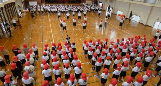 今回は 天候不順のため、体育館で「応援合戦」の練習をしました。