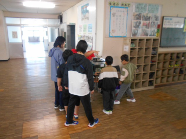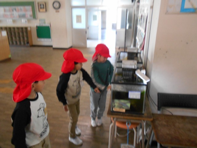 なかよし学級の子供たちが学校たんけんを行っていました。廊下においてある水槽の魚を興味深く見ていました。
