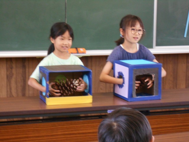 休み時間など、子供たちが、自分や友達の作品を楽しんでいました。