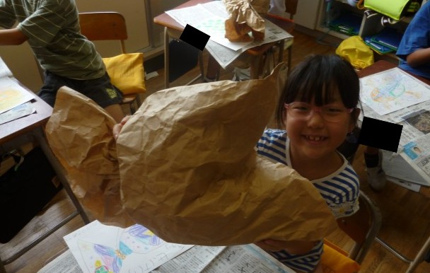 今回は、セットの中に 何が入っているかや、人形のもとになる 少し固めの紙を、くしやくしゃにすることによって、紙がやわらかくなり、形を変えやすくなることを確かめていきました。