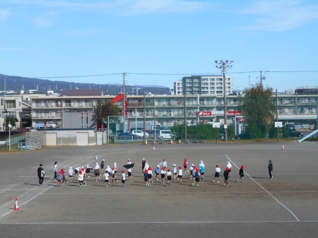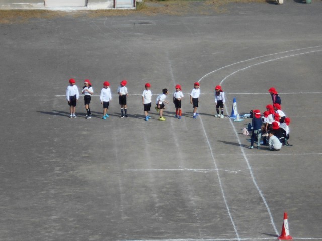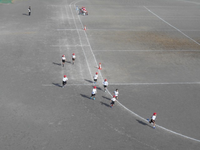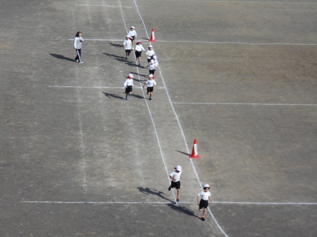 今日からかけ足運動が始まりました。2年生が元気よく4分間を走ってました。