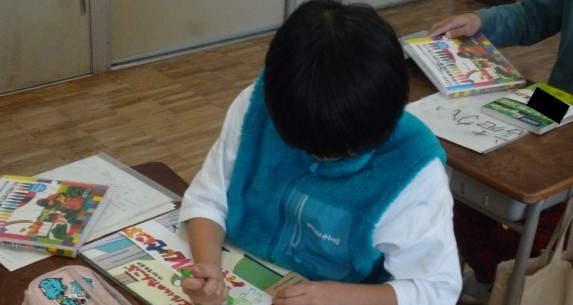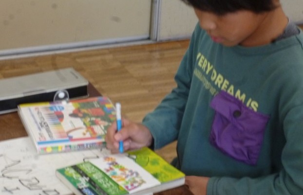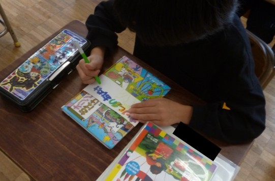 子供たちは、「本の『帯』を作ろう」の学習を進めています。自分が1・2年生におすすめしたい本の「帯」作りに取り組んでいます。