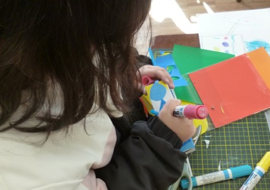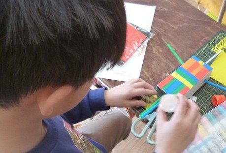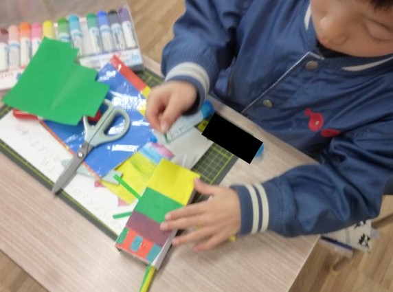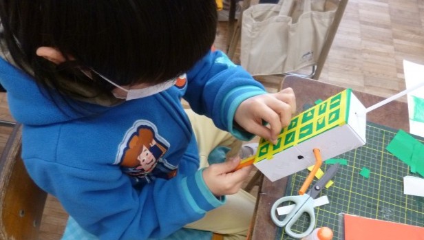 今回は、部屋の中や窓、建物の壁などを仕上げていきました。カラーペンやクーピーを使って、自分の思いが詰まった建物を仕上げることができました。