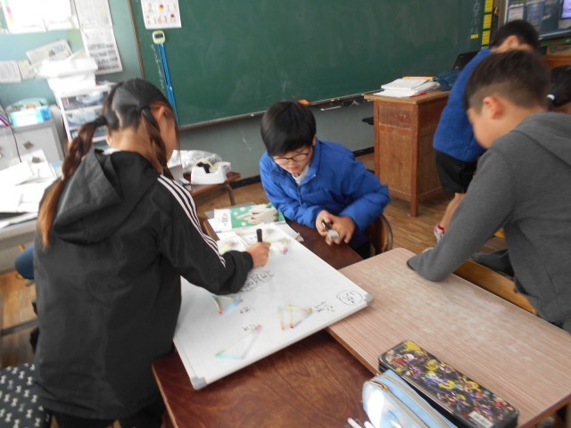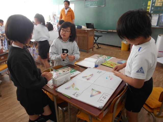 前日ストローでたくさん作った三角形をグループで仲間分けしました。