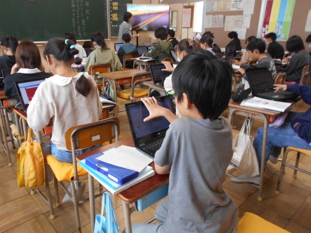 「流れる水のはたらきと土地の変化」の学習です。グループごとに土の斜面に溝を掘って川に見立て、流れる水の様子を観察しました。1回目の実験が終わると、撮影した動画をチェックしながら、次の実験の作戦をたてていました。